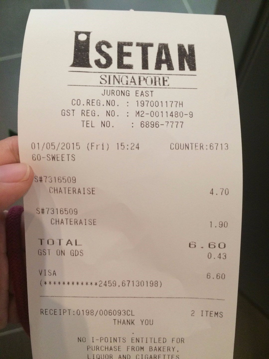 In Singapore, receipts are usually in English. The receipt OCR should be able to handle receipts in any language. For example, the image on right displays a receipt received in Singapore: