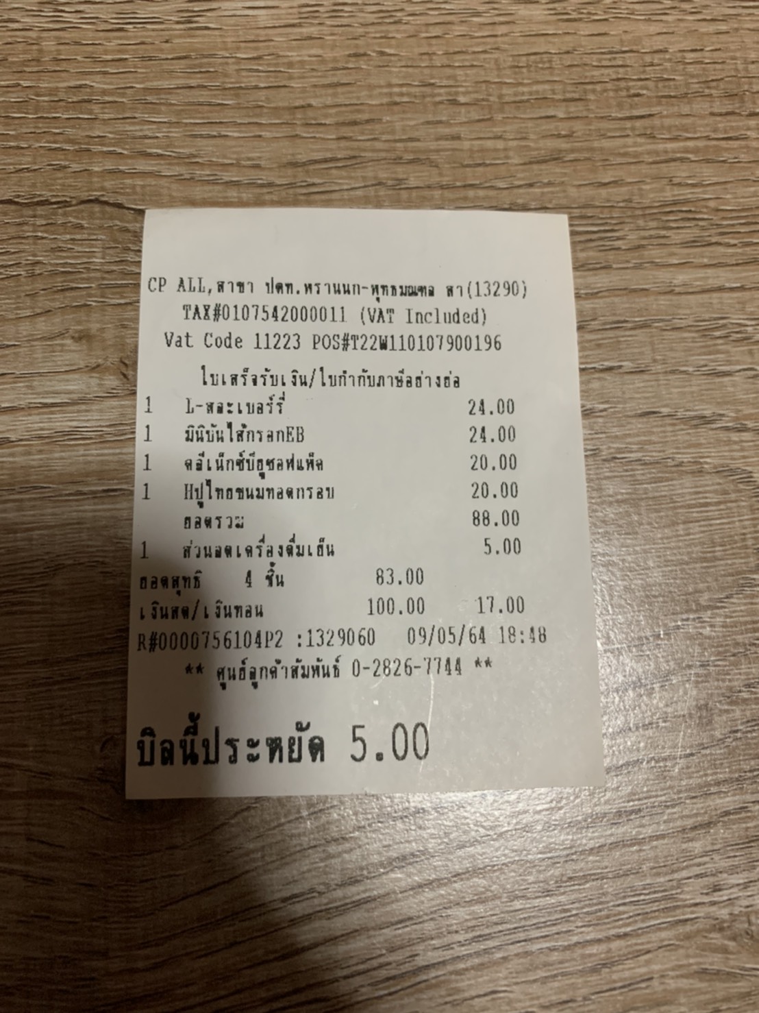 In Thailand ประเทศไทย, receipts are usually in Thai ภาษาไทย or English language. The receipt OCR should be able to handle receipts in any language. For example, the image on right displays a receipt received in Thailand ประเทศไทย: